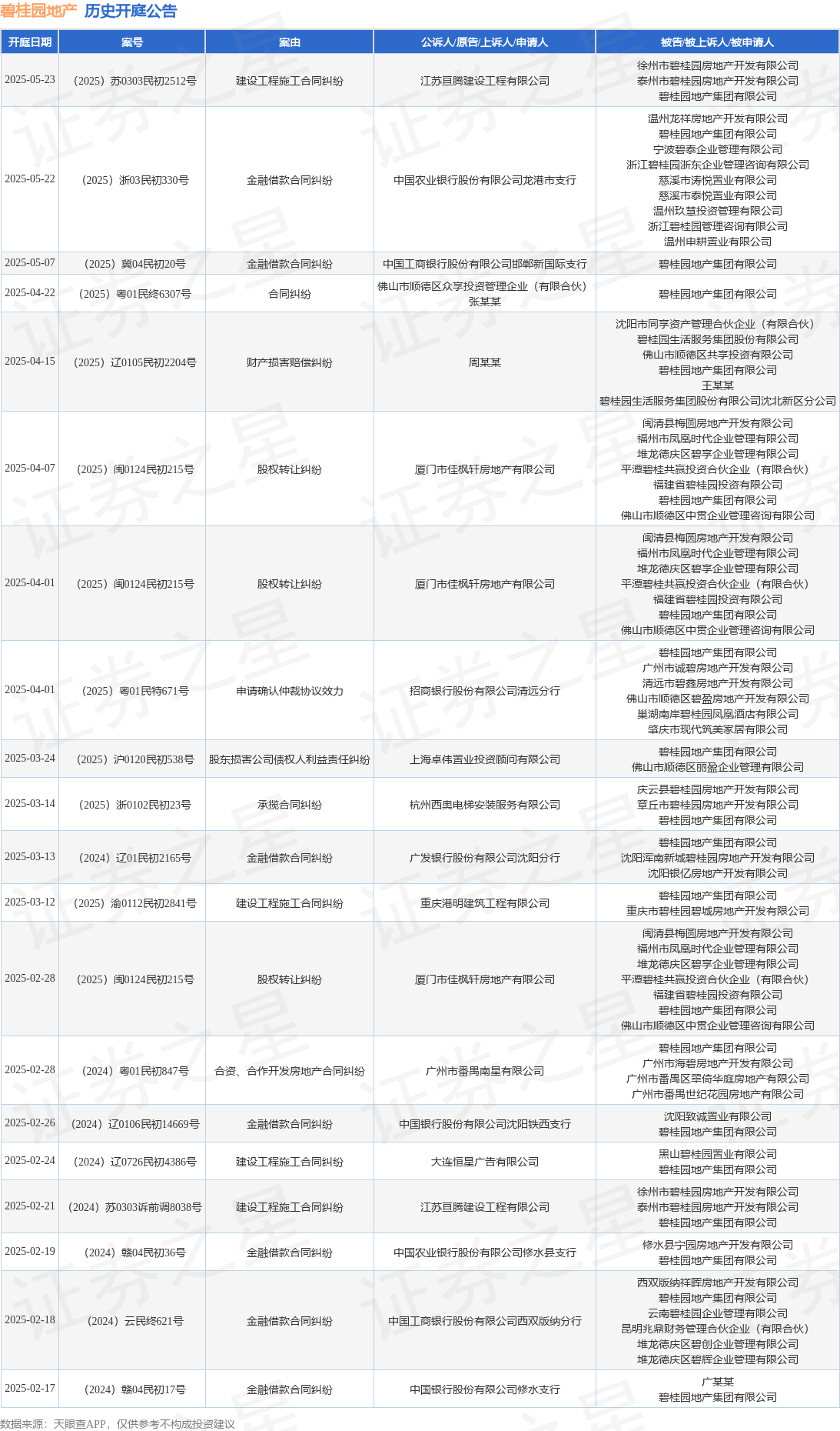 案号:(2025)闽0124民初215号根据统计,近一年内以碧桂园地产集团有限公司为当事人的历史开庭公告有160则,其中案由为“金融借款合同纠纷”的公告以52则居首,其次为“建设工程施工合同纠纷”有24则,“合资、合作开发房地产合同纠纷”有14则。历史开庭公告(前20条)如下:
