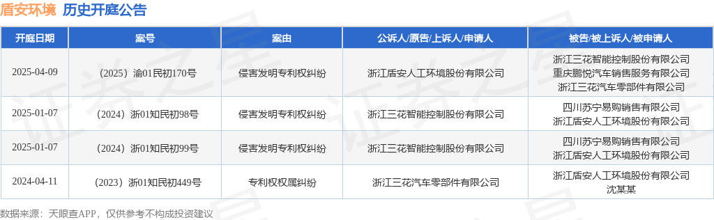 根据统计,近一年内以浙江盾安人工环境股份有限公司为当事人的历史开庭公告有4则,其中案由为“侵害发明专利权纠纷”的公告以3则居首,其次为“专利权权属纠纷”有1则。历史开庭公告如下: