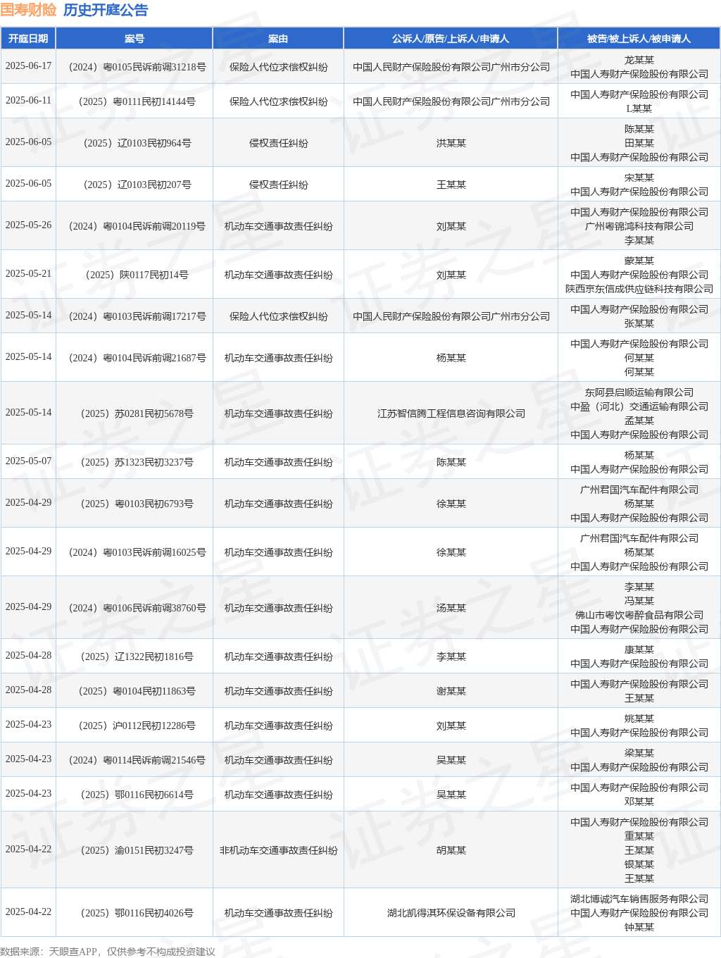 案号:(2024)粤0307民初35862号根据统计,近一年内以中国人寿财产保险股份有限公司为当事人的历史开庭公告有481则,其中案由为“机动车交通事故责任纠纷”的公告以325则居首,其次为“保险人代位求偿权纠纷”有46则,“侵权责任纠纷”有15则。历史开庭公告(前20条)如下: