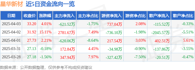 证券之星消息,截至2025年4月3日收盘,星华新材(301077)报收于33.2元,上涨4.01%,换手率16.97%,成交量11.05万手,成交额3.55亿元。