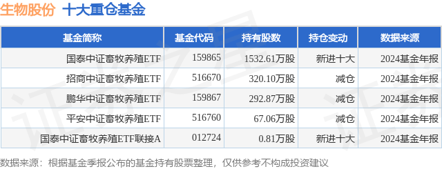 根据2024基金年报公募基金重仓股数据,重仓该股的公募基金共5家,其中持有数量最多的公募基金为国泰基金的国泰中证畜牧养殖ETF。国泰中证畜牧养殖ETF目前规模为32.32亿元,最新净值0.5819(4月3日),较上一交易日上涨2.2%,近一年下跌9.36%。该公募基金现任基金经理为梁杏。梁杏在任的基金产品包括:国泰国证医药卫生行业指数A,管理时间为2016年6月8日至今,期间收益率为17.41%;国泰量化收益灵活配置混合A,管理时间为2018年7月31日至今,期间收益率为5.69%;国泰中证生物医药ETF联接A,管理时间为2019年4月16日至今,期间收益率为-3.38%;国泰中证生物医药ETF,管理时间为2019年4月18日至今,期间收益率为-5.06%。