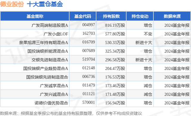 根据2024基金年报公募基金重仓股数据,重仓该股的公募基金共124家,其中持有数量最多的公募基金为广发基金的广发高端制造股票A。广发高端制造股票A目前规模为61.43亿元,最新净值1.1978(4月3日),较上一交易日下跌2.78%,近一年下跌18.47%。该公募基金现任基金经理为郑澄然。郑澄然在任的基金产品包括:广发鑫享灵活配置混合A,管理时间为2020年5月20日至今,期间收益率为37.6%;广发兴诚混合A,管理时间为2021年1月6日至今,期间收益率为-56.7%;广发诚享混合A,管理时间为2021年2月8日至今,期间收益率为-56.31%。