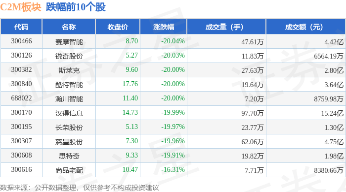 证券之星消息,4月7日C2M板块较上一交易日下跌8.75%,赛摩智能领跌。当日上证指数报收于3096.58,下跌7.34%。深证成指报收于9364.5,下跌9.66%。C2M板块个股涨跌见下表: