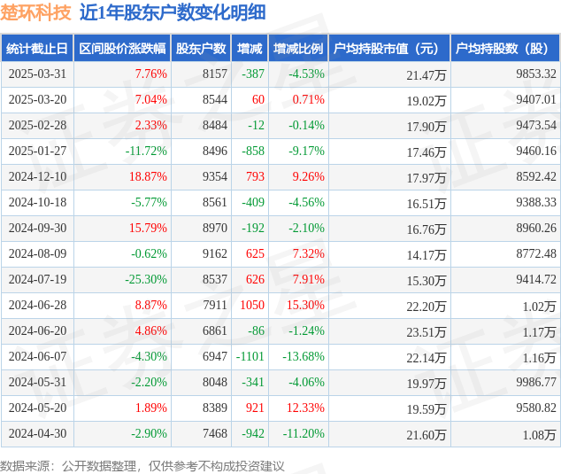 从股价来看,2025年3月20日至2025年3月31日,楚环科技区间涨幅为7.76%,在此期间股东户数减少387.0户,减幅为4.53%。