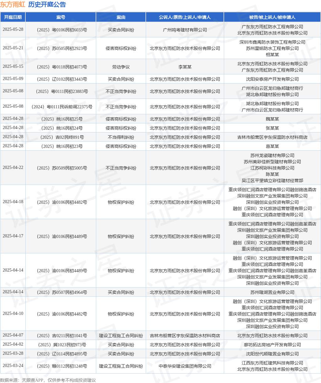 案号:(2025)渝0106民初4482号根据统计,近一年内以北京东方雨虹防水技术股份有限公司为当事人的历史开庭公告有142则,其中案由为“买卖合同纠纷”的公告以48则居首,其次为“侵害商标权纠纷”有22则,“票据追索权纠纷”有17则。历史开庭公告(前20条)如下: