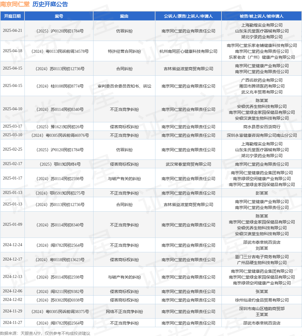 案号:(2024)苏0114民初8340号根据统计,近一年内以南京同仁堂药业有限责任公司为当事人的历史开庭公告有87则,其中案由为“不正当竞争纠纷”的公告以38则居首,其次为“侵害商标权纠纷”有11则,“擅自使用他人有一定影响的企业名称、社会组织名称、姓名纠纷”有11则。历史开庭公告(前20条)如下: