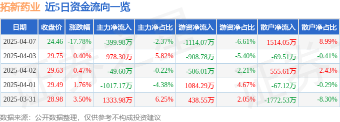 证券之星消息,截至2025年4月7日收盘,拓新药业(301089)报收于24.46元,下跌17.78%,换手率7.0%,成交量6.37万手,成交额1.68亿元。