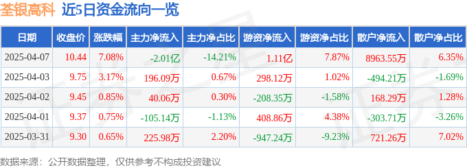 证券之星消息,截至2025年4月7日收盘,荃银高科(300087)报收于10.44元,上涨7.08%,换手率15.11%,成交量135.38万手,成交额14.13亿元。