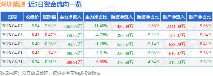 证券之星消息,截至2025年4月7日收盘,深圳能源(000027)报收于5.94元,下跌7.62%,换手率0.81%,成交量38.56万手,成交额2.33亿元。