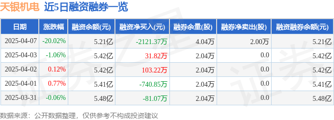 证券之星消息,截至2025年4月7日收盘,天银机电(300342)报收于13.46元,下跌20.02%,换手率6.72%,成交量28.08万手,成交额4.03亿元。