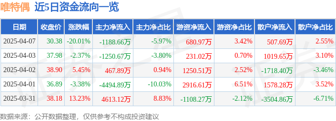 证券之星消息,截至2025年4月7日收盘,唯特偶(301319)报收于30.38元,下跌20.01%,跌停,换手率15.97%,成交量6.17万手,成交额1.99亿元。