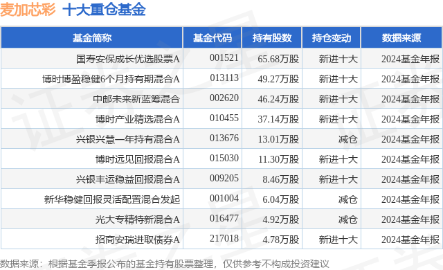 根据2024基金年报公募基金重仓股数据,重仓该股的公募基金共15家,其中持有数量最多的公募基金为国寿安保基金的国寿安保成长优选股票A。国寿安保成长优选股票A目前规模为5.21亿元,最新净值0.956(4月7日),较上一交易日下跌12.93%,近一年下跌9.38%。该公募基金现任基金经理为祁善斌 撒伟旭。祁善斌在任的基金产品包括:国寿安保核心产业混合,管理时间为2024年3月8日至今,期间收益率为3.34%。撒伟旭在任的基金产品包括:国寿安保新材料股票发起式A,管理时间为2023年11月6日至今,期间收益率为27.81%;