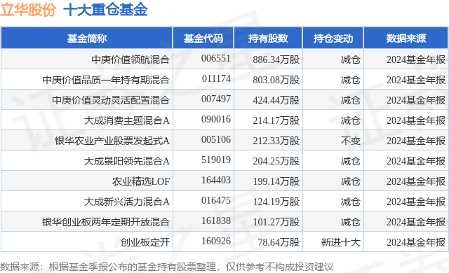 根据2024基金年报公募基金重仓股数据,重仓该股的公募基金共17家,其中持有数量最多的公募基金为中庚基金的中庚价值领航混合。中庚价值领航混合目前规模为27.42亿元,最新净值2.1836(4月7日),较上一交易日下跌10.28%,近一年下跌5.56%。该公募基金现任基金经理为刘晟。