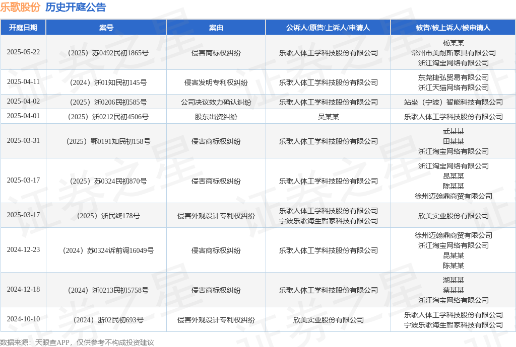案号:(2024)浙01知民初145号根据统计,近一年内以乐歌人体工学科技股份有限公司为当事人的历史开庭公告有10则,其中案由为“侵害商标权纠纷”的公告以5则居首,其次为“侵害外观设计专利权纠纷”有2则,“侵害发明专利权纠纷”有1则。历史开庭公告如下: