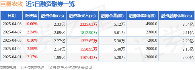 巨星农牧融资融券信息显示,融资方面,当日融资买入1.08亿元,融资偿还8493.57万元,融资净买入2325.63万元。融券方面,融券卖出3900.0股,融券偿还8800.0股,融券余量5.12万股,融券余额118.27万元。融资融券余额2.34亿元。