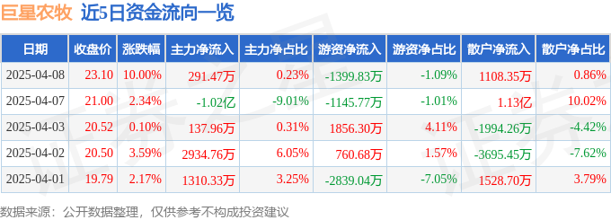 证券之星消息,截至2025年4月8日收盘,巨星农牧(603477)报收于23.1元,上涨10.0%,涨停,换手率11.43%,成交量58.31万手,成交额12.88亿元。