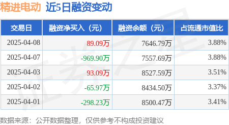 证券之星消息,4月8日,精进电动(688280)融资买入563.3万元,融资偿还474.2万元,融资净买入89.09万元,融资余额7646.79万元,近20个交易日中有12个交易日出现融资净买入。