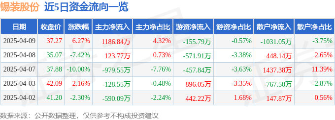 证券之星消息,截至2025年4月9日收盘,锡装股份(001332)报收于37.27元,上涨6.27%,换手率27.38%,成交量7.39万手,成交额2.75亿元。