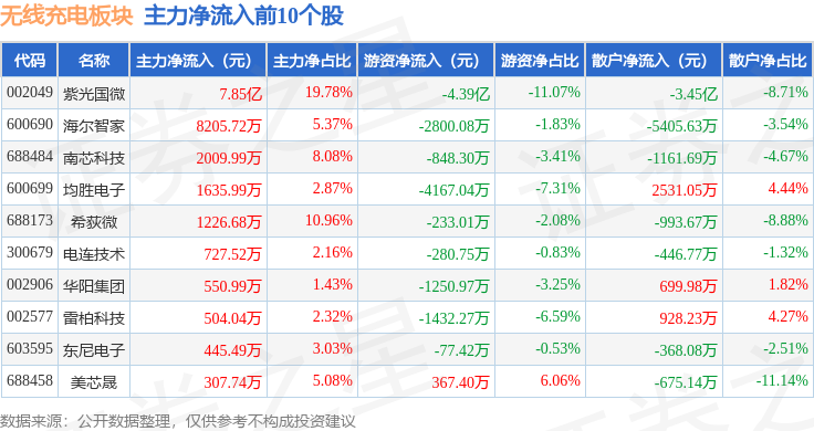从资金流向上来看,当日无线充电板块主力资金净流入2.89亿元,游资资金净流出10.23亿元,散户资金净流入7.34亿元。无线充电板块个股资金流向见下表: