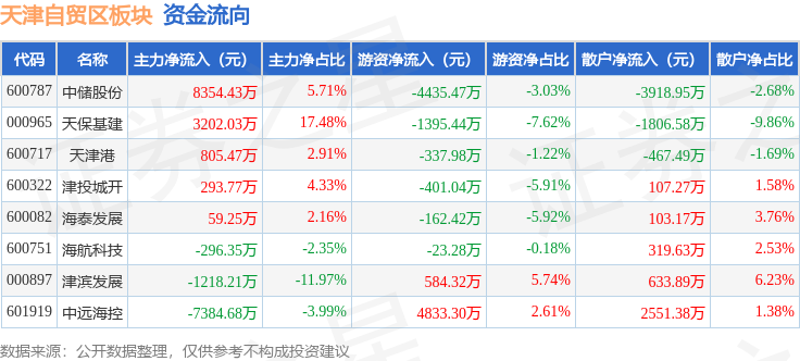 从资金流向上来看,当日天津自贸区板块主力资金净流入3815.71万元,游资资金净流出1338.03万元,散户资金净流出2477.68万元。天津自贸区板块个股资金流向见下表: