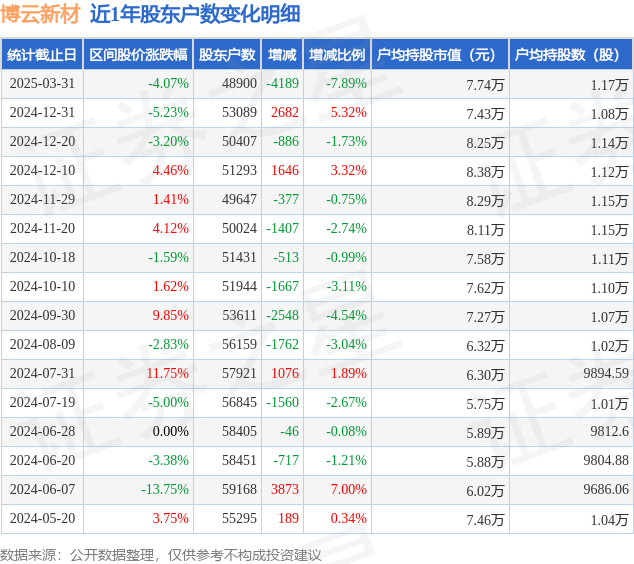 从股价来看,2024年12月31日至2025年3月31日,博云新材区间跌幅为4.07%,在此期间股东户数减少4189.0户,减幅为7.89%。