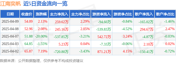 证券之星消息,截至2025年4月9日收盘,江南奕帆(301023)报收于54.09元,上涨2.13%,换手率7.34%,成交量2.19万手,成交额1.13亿元。