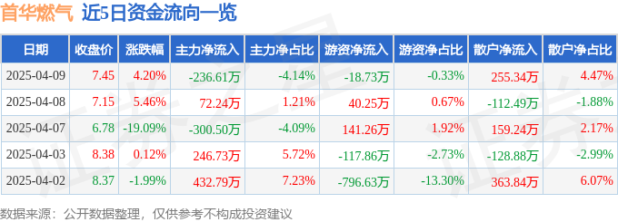 证券之星消息,截至2025年4月9日收盘,首华燃气(300483)报收于7.45元,上涨4.2%,换手率3.0%,成交量8.04万手,成交额5709.1万元。