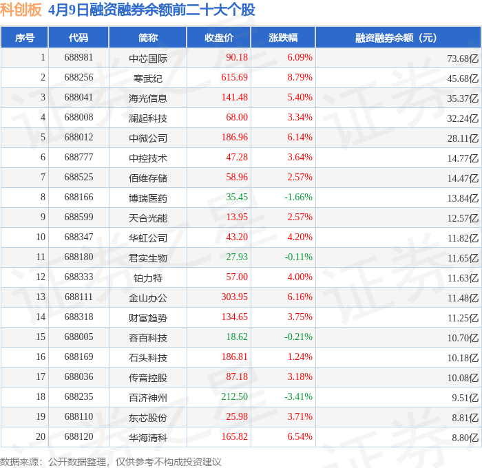 科创板融资融券余额前三分别为:中芯国际(688981)融资融券余额73.68亿元、寒武纪(688256)融资融券余额45.68亿元、海光信息(688041)融资融券余额35.37亿元,前20具体见下表: