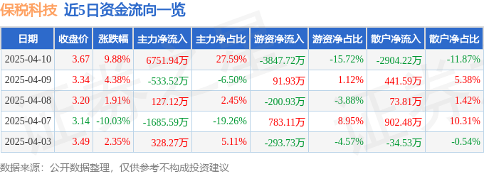 4月10日的资金流向数据方面,主力资金净流入6751.94万元,占总成交额27.59%,游资资金净流出3847.72万元,占总成交额15.72%,散户资金净流出2904.22万元,占总成交额11.87%。