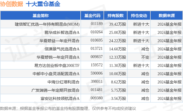 根据2024基金年报公募基金重仓股数据,重仓该股的公募基金共29家,其中持有数量最多的公募基金为建信基金的建信智汇优选一年持有期混合(MOM)。建信智汇优选一年持有期混合(MOM)目前规模为12.46亿元,最新净值0.6983(4月9日),较上一交易日上涨1.16%,近一年下跌3.68%。该公募基金现任基金经理为姚波远。姚波远在任的基金产品包括:建信福泽安泰混合(FOF)A,管理时间为2023年8月31日至今,期间收益率为-6.12%;建信优享进取养老目标五年持有期混合发起(FOF)A,管理时间为2024年1月12日至今,期间收益率为12.37%。