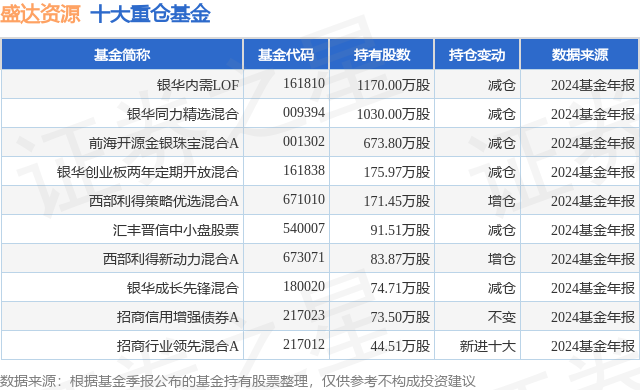 根据2024基金年报公募基金重仓股数据,重仓该股的公募基金共14家,其中持有数量最多的公募基金为银华基金的银华内需LOF。银华内需LOF目前规模为14.45亿元,最新净值2.72(4月9日),较上一交易日上涨2.56%,近一年下跌4.29%。该公募基金现任基金经理为刘辉 王利刚。刘辉在任的基金产品包括:银华同力精选混合,管理时间为2020年6月16日至今,期间收益率为-13.16%;银华创业板两年定期开放混合,管理时间为2020年8月7日至今,期间收益率为-37.06%。王利刚在任的基金产品包括:银华成长先锋混合,管理时间为2019年12月31日至今,期间收益率为-21.45%;银华创业板两年定期开放混合,管理时间为2020年8月7日至今,期间收益率为-37.06%;银华同力精选混合,管理时间为2021年4月26日至今,期间收益率为-12.3%;