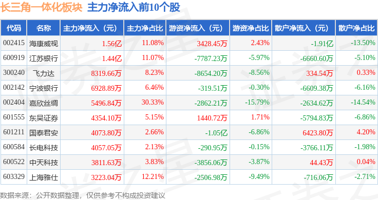 从资金流向上来看,当日长三角一体化板块主力资金净流出9.76亿元,游资资金净流入3.97亿元,散户资金净流入5.79亿元。长三角一体化板块个股资金流向见下表: