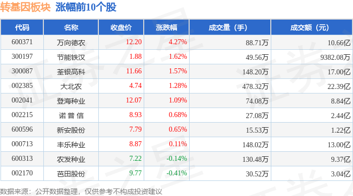 证券之星消息,4月10日转基因板块较上一交易日上涨0.72%,万向德农领涨。当日上证指数报收于3223.64,上涨1.16%。深证成指报收于9754.64,上涨2.25%。转基因板块个股涨跌见下表: