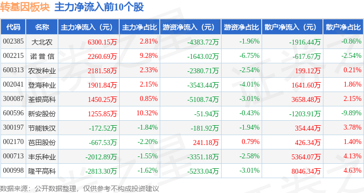 从资金流向上来看,当日转基因板块主力资金净流入46.26万元,游资资金净流出2.3亿元,散户资金净流入2.29亿元。转基因板块个股资金流向见下表: