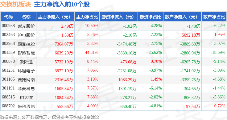 从资金流向上来看,当日交换机板块主力资金净流出11.58亿元,游资资金净流入3512.49万元,散户资金净流入11.23亿元。交换机板块个股资金流向见下表: