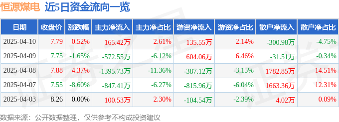 证券之星消息,截至2025年4月10日收盘,恒源煤电(600971)报收于7.79元,上涨0.52%,换手率0.68%,成交量8.12万手,成交额6340.13万元。