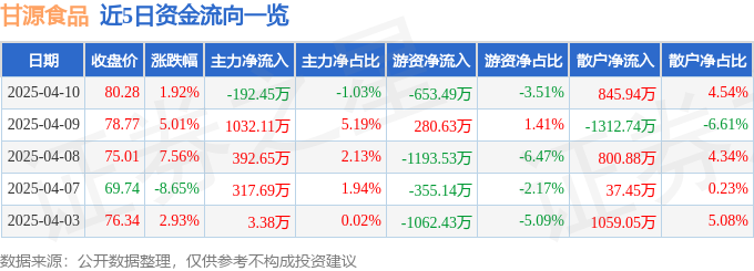 证券之星消息,截至2025年4月10日收盘,甘源食品(002991)报收于80.28元,上涨1.92%,换手率4.72%,成交量2.35万手,成交额1.86亿元。