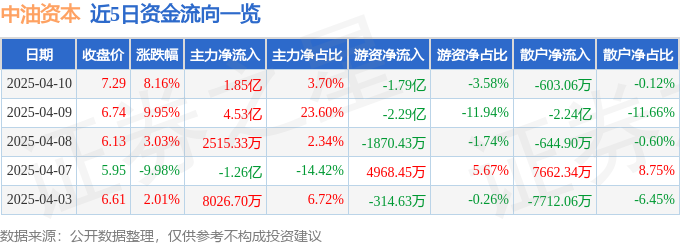 证券之星消息,截至2025年4月10日收盘,中油资本(000617)报收于7.29元,上涨8.16%,换手率5.52%,成交量697.8万手,成交额50.01亿元。