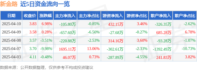4月10日的资金流向数据方面,主力资金净流出105.8万元,占总成交额0.85%,游资资金净流入432.15万元,占总成交额3.46%,散户资金净流出326.35万元,占总成交额2.62%。