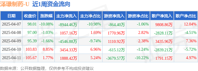 资金流向数据方面,本周泽璟制药-U主力资金合计净流出7091.43万元,游资资金合计净流出2277.22万元,散户资金合计净流入9368.65万元。本周资金流向一览见下表: