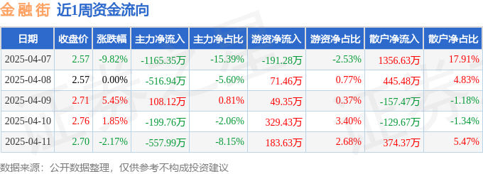 资金流向数据方面,本周金 融 街主力资金合计净流出2331.92万元,游资资金合计净流入442.59万元,散户资金合计净流入1889.33万元。本周资金流向一览见下表: