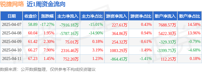 资金流向数据方面,本周锐捷网络主力资金合计净流出1.06亿元,游资资金合计净流入1065.62万元,散户资金合计净流入9494.04万元。本周资金流向一览见下表:
