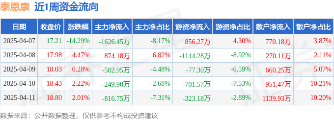 资金流向数据方面,本周泰恩康主力资金合计净流出2401.87万元,游资资金合计净流出1390.06万元,散户资金合计净流入3791.93万元。本周资金流向一览见下表: