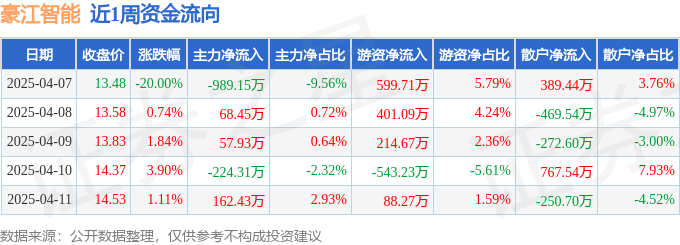 资金流向数据方面,本周豪江智能主力资金合计净流出924.64万元,游资资金合计净流入760.51万元,散户资金合计净流入164.14万元。本周资金流向一览见下表: