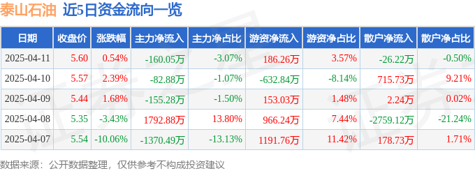 证券之星消息,截至2025年4月11日收盘,泰山石油(000554)报收于5.6元,上涨0.54%,换手率2.56%,成交量9.29万手,成交额5210.94万元。
