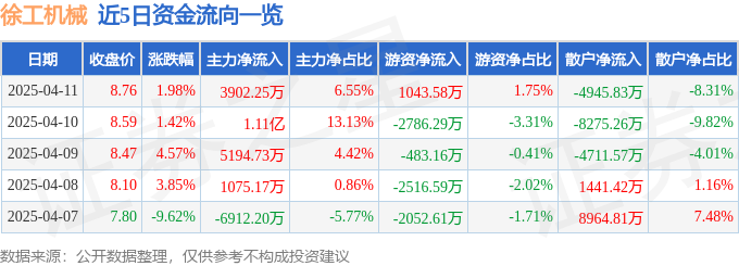 证券之星消息,截至2025年4月11日收盘,徐工机械(000425)报收于8.76元,上涨1.98%,换手率0.85%,成交量68.81万手,成交额5.95亿元。