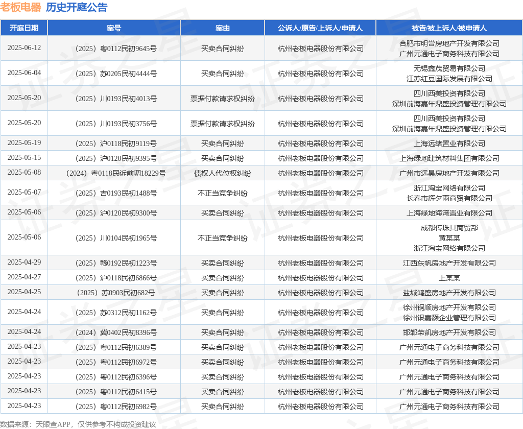 案号:(2025)吉01民初65号根据统计,近一年内以杭州老板电器股份有限公司为当事人的历史开庭公告有229则,其中案由为“买卖合同纠纷”的公告以133则居首,其次为“侵害商标权纠纷”有49则,“票据追索权纠纷”有9则。历史开庭公告(前20条)如下: