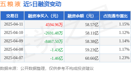 证券之星消息,4月11日,五 粮 液(000858)融资买入1.83亿元,融资偿还1.37亿元,融资净买入4594.96万元,融资余额58.57亿元,当日融资净买入排名第31。