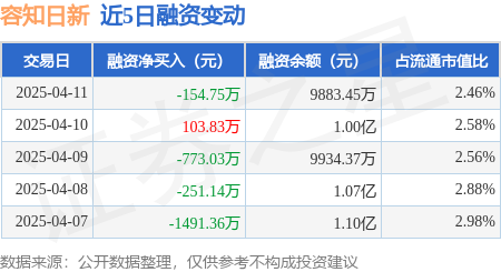证券之星消息,4月11日,容知日新(688768)融资买入226.63万元,融资偿还381.38万元,融资净卖出154.75万元,融资余额9883.45万元,近20个交易日中有12个交易日出现融资净买入。