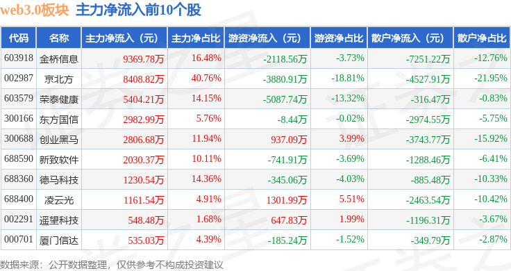 从资金流向上来看,当日web3.0板块主力资金净流入1.43亿元,游资资金净流出3868.34万元,散户资金净流出1.05亿元。web3.0板块个股资金流向见下表:
